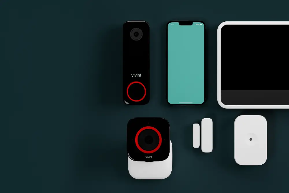 Full home security system kit including wireless cameras, door sensors, a video doorbell, motion detector, and touchscreen panel—ideal for alarm system installation and smart home protection.
