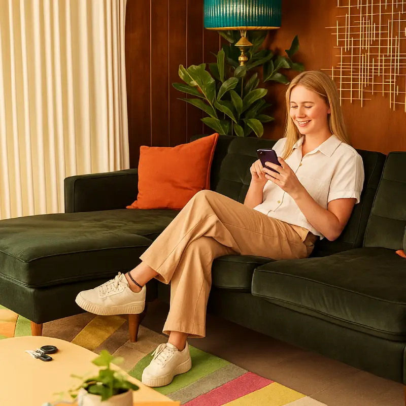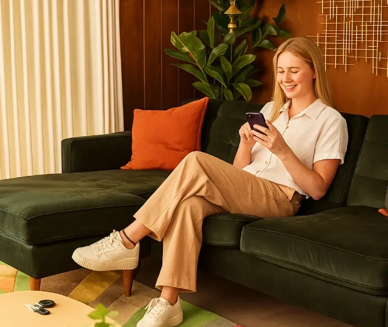 Young woman sitting on a sofa using a smartphone app to control her smart home security system, highlighting wireless alarm features and remote monitoring convenience.