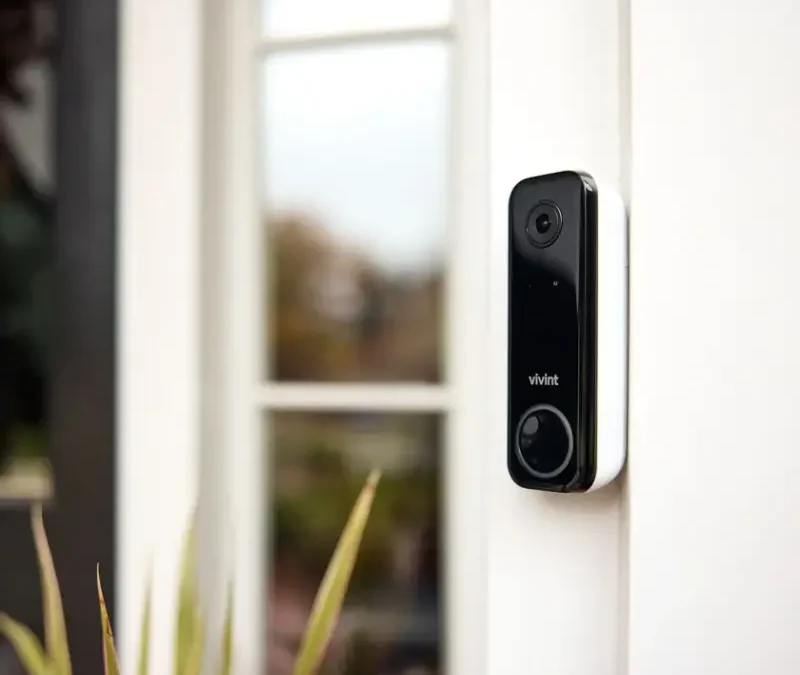 Vivint smart doorbell camera mounted at a front door, providing wireless home security with real-time video alerts and integration with smart alarm systems.
