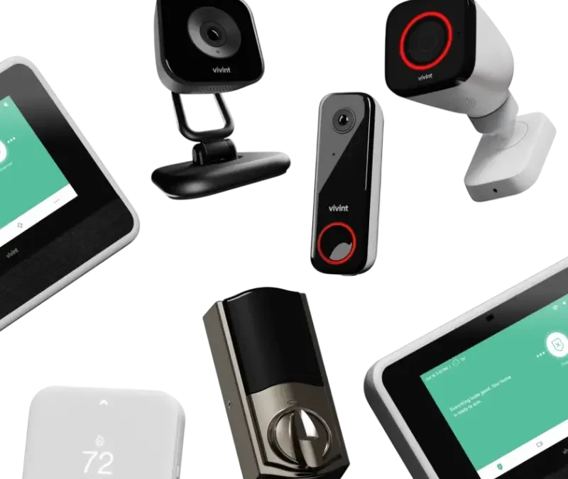 Assortment of Vivint smart security devices including indoor and outdoor cameras, video doorbell, touchscreen control panels, smart thermostat, and keyless smart lock for a comprehensive home alarm system.